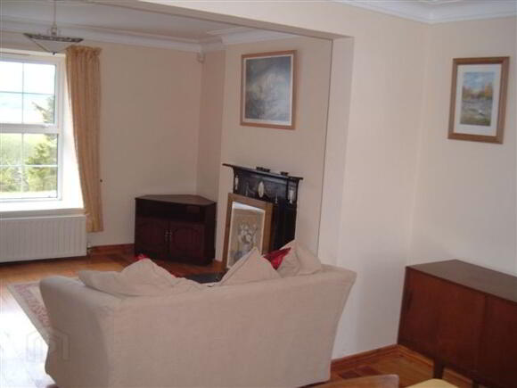 Sitting room boasts great views as described. This spacious room has an open fire is furnished and provision is made for a dining area. Solid wood floor covering.